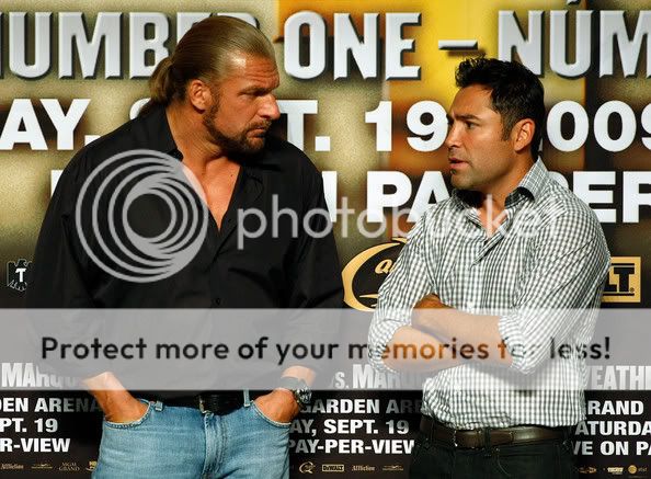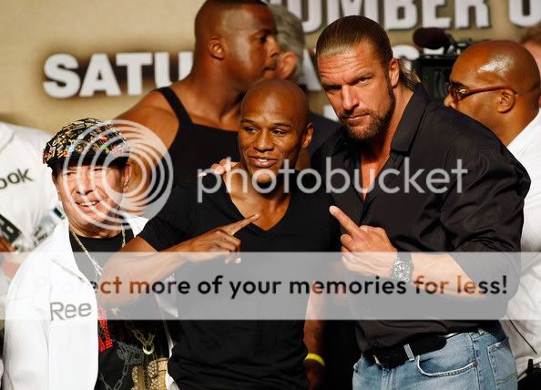 - Pora nuotrauku is HBO: Mayweather vs. Marquez sverimu vakar, Rugsejo 18 diena, kur su Floyd Mayweather, Jr. matome WWE zvaigzde Paul "Triple H" Levesque. Kitoje nuotraukoje The Game yra su bokso legenda, Oscar De La Hoya (Golden Boy Promotions savinininkas ir Juan Manuel Marquez promoteris). Priminsiu, kad Trips bus Floyd kampe siandienos matche ir lides Mayweather i ringa.