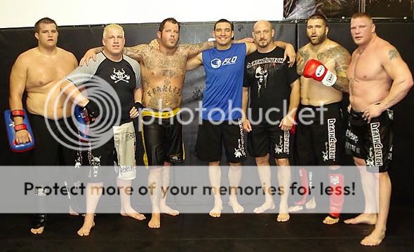 Arba kitas video CIA (su lasu uzkulisiu). Cia Cole Konrad nuotrauka su MMAA nariais (Lesnar trenerociu partneriais/treneriais) is kaires i desine: imtiniu partneris Cole Konrad, trenerociu partneris Chris Tuscherer, man nezinomas veikejas, BJJ treneris Rodrigo "Comprido" Medeiros, imtiniu treneris Marty Morgan, terenrociu partneris Kirk Klosowsky ir pats Brock Lesnar.