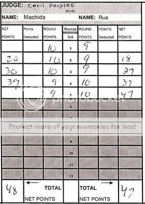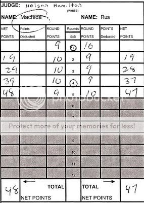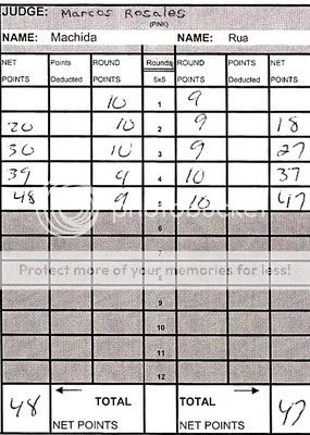 - Jei kam idomu, cia CSAC (California State Athletic Commission) paskirtu soniniu teiseju korteles is pagrindines Spalio 24 dienos UFC 104: Machida vs. Shogun renginio kovos, t.y. susitikimo tarp UFC Light Heavyweight Championo Lyoto Machida ir pretendento Mauricio Rua. Teisejai Cecil Peoples ir Marcos Rosales atidave championui pirma, antra ir trecia raundus, o Nelson Hamilton - antra, trecia ir ketvirta. Bendrai, pas visus teisejus isejo, kad The Dragon laimejo su 48-47.