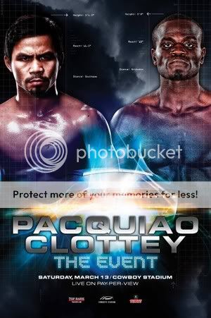 Pacquiao vs. Clottey: On Saturday, March 13th pound-for-pound best Manny Pacquiao takes his talents to one of the biggest stages in sports, Cowboys Stadium, where he will face No. 1 contender and former world welterweight champion, Joshua Clottey. The iron-chinned Clottey is as tough as they come, a rock-solid puncher and a career packed with thrilling victories and ferocious battles. Pacquiao, with a blistering array of speed and power, has captured his last three world championships by knockout. Both fighters are guaranteeing victory!