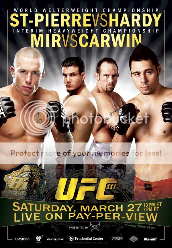 UFC 111: St. Pierre vs. Hardy: Two world titles are on the line. UFC welterweight champion Georges St-Pierre defends his title against Dan Hardy. Plus, Frank Mir and Shane Carwin battle for the interim heavyweight crown. Don't miss UFC 111: St-Pierre vs. Hardy, March 27th, live on Pay-Per-View from Newark, NJ.