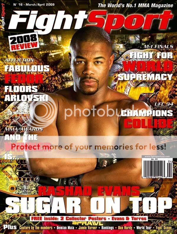 - 2009 metu kovo/balandzio menesiu Fight Sport zurnalo virseli puosia veikiantis UFC Light Heavyweight Championas, The Ultimate Fighter 2 sunkiasvoriu turnyro nugaletojas Rashad Evans, kuris geguzes 23 diena UFC 98: Evans vs. Machida rengenyje gins savo auksa pries kita nenugaleta kovotoja, Lyoto Machida.