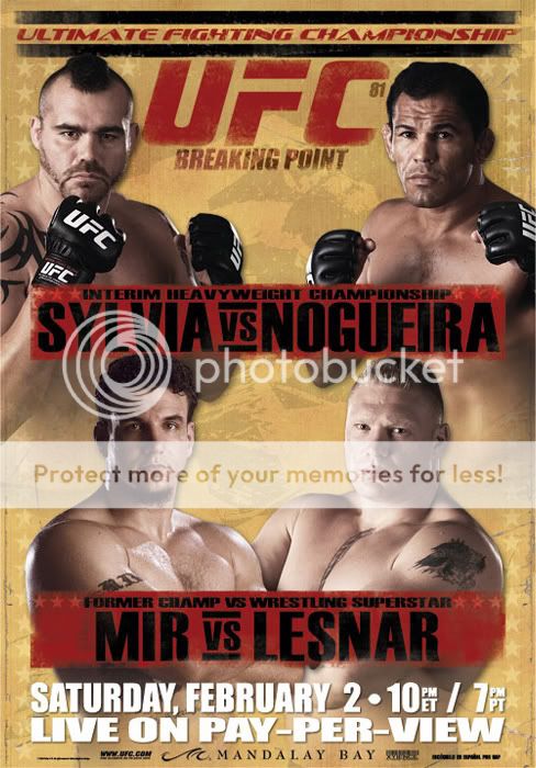 Pradesime nuo, taip vadinamo, main-evento - Tim Sylvia ir Antonio Rodrigo Nogueira, nes faktiskai UFC visada, koks didelis bebutu co-main-eventas, stato savo championship kovas i headlinerius. Sie du susitinka del Interim (laikino) UFC sunkiasvoriu aukso. Tam priezastis ne ta, kad jie naiviai tikisi Randy Couture grizimo, bet verciau ta, kad greit prasides rimtos teismo batalijos (nes kolkas si byla, kuri siandien guli teisme yra ne del Couture kovojimo kontrakto, bet del jo idarbinimo kontrakto) ir UFC nores rodyti, kad jie visdar pripazista ji savo championu. Realybe ta, kad kova tarp Big Nog ir Big Tim potencialiai gali buti labai nuobodi. Akivaizdziai, Nogueira yra laikomas vienas talentingiausiu (jei ne talentingiausiu) grappleriu sporto HW divizione, BET Antonio paprastai turi problemu su takedownais ir tai yra jo silpna puse. Kai savo eile, Tim Sylvia yra MFS (Pat Miletich) mokinis ir turi tvirta TD ginyba. Aisku jo UFC 68 kova su Randy parode jo silpnybe pries Couture agresivias graiku-romenu TD, bet nepamirskime, kad istorija dar nemate zmogaus, kuris nenukeliauu bent karta ant grindu nuo Captain America ranku (iskaitant Chuck Liddell su jo vos ne legendine TD ginyba), kai Nogueira yra BJJ praktikotojas ir sauna i kojas, skirtingai nuo The Natural, kuris dazniausiai isnaudoja clincha su kojos pakisimu (trip). Taigi, grinai mano nuomone, The Maine-iac gales islaikyti kova stovesenoje. O ant koju mes turesime Sylvia ilga jab'a pries Nogueiros boksa, kuris, su visa pagarba jam, pakankamai geras, bet ziurekime tiesai i akys - Antonio is 30 karjeros pergaliu turi tik 3 via KO/TKO. Strikingo kovoje Rodrigo realiai turi viena nuostabu ginkla - savo metalini smakra, kuris, visu nuostabai, tik kovoje su Heath (UFC 73) parode sioki toki silpnuma. Is esmes as matau kova einancia distancija, nes sudejus viska, Nogueira negales nutempti Sylvia ant grindu, o pastarasis kaip iprasta nerizikos ir besinaudos savo ilga reach, isjab'indamas sau kelia i teiseju sprendima, nes sprogimus is Tim mes matom labai retai (o jei ir buna, tai paprastai "1, 2" kombinacijos), o paprastu jabu neuzteks, kad baigti pirmo PRIDE FC sunkiasvoriu championo, kuris iki siol savo karjeroje nebuvo "sustabdytas" kovoje + manau, skirtingai nuo UFC 77 kovos su Brandon, The Maine-iac vengs clincho su Antonio, kadangi tai duotu galimybe Nog nutempti ji i BJJ pasauli, nors Tim ir turetu pranasuma clinche su keliais ir dirty boxing (kuri jis turi, nors nerode kovoje su Vera, nes bijojo provakoti Brandono atsakimo Muay Thai stiliumi;) Zodziu as prognazoju, kad neziurint i brazilo talenta ir favorito statusa, Tim paims savo trecia karuna UFC sunkaisvoriu divizione ir ieis i istorija kaip (kolkas) tik antras trys-kart championas 265 svaruose, po Randy. Via boring decision