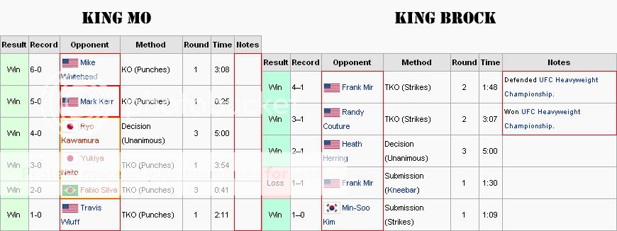 Dabar siulau tau uzeiti CIA ir CIA. Kaip matai, Min Soo-Kim vardas yra melinos spalvos - Wikipdijoje tai reiskia, kad apie ji yra informacija duomenu bazeje. King Mo stulpelyje matau raudonus vardus - matai, tai reiskia, kad apie jos nera duomenu. Abu Brock ir Muhammed buvo pasikele nuo pirmos savo kovos - skirtumas tas, kad Lesnar pirmoje kovoje nugalejo Olimpini sidabro medalista, o Lawal... na YAMMA (what?) Heavyweight Championa :D O toliau, savo sekanciose kovuose Brock paskubejo padeti pagrinda po savo skambiais zodziais - jis debiutavo UFC pries buvusi championas, dominavo gerbiama PRIDE FC veterana, kuris yra geresne opozicija nei betkoks kovotojas King Mo siandienos recorde, nukarunavo veikianti championa ir net spejo apginti titula. Kaip Lawal po savo pirmos kovos skubejo suteikti sau itikinamumo? Sumuse du Wikipedijos raudonukus, nesugebejo baigti Pancrase (what?) Light Heavyweight Championo, patvarke stora Mark f'n Kerr (!) ir paeme pergale pries ziauriai sustorejusi Mike Whitehead? Lesnar po MMA debiuto reikalavo kovu del pasaulio titulu ir nesedejo sudejes rankas, o paskubejo jas gauti, o ne eiti ir musti storus buvusius steroidininkus po antraruses ir treciaruses kompanijas. Taigi Lawal reiktu nugaleti Gegard arba uzsiciaupti.