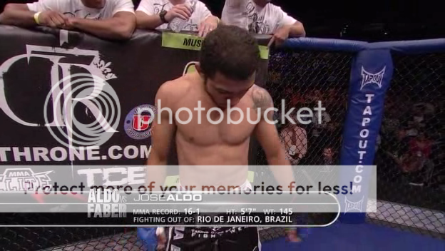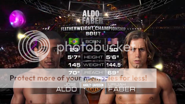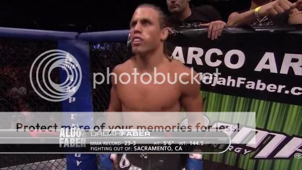 NOTE: Cia pagrindine kova is World Extreme Cagefighting pay-per-view debiuto, nors oficialiai si sudetis nera priskiriama WEC... Formaliai, ji nera priskiriama jokiai organizacijai, o vadinama tiesiog "Ado vs. Faber", del poros priezasciu. Visu pirma, is teisinio poziurio - WEC turi ekskliuzivu kontrakta su Versus kanalu savo produkto transliacijoms, taigi kad si PPV reklamojanti laida "Countdown to Aldo vs. Faber" galetu buti rodoma per MTV2 bei Spike TV kanalus, jiems reiekjo atsikratiti asociacijos su WEC. Antra priezastis, tai elementarus UFC prezidento (to paciu ir Zuffa, LLC prezidento) Dana White isitikinimas, kad WEC raidziu figuravimas atbaidins potencialius pirkejus. Pereinam prie pacios kovos. Sis susitikimas yra reklamojas kaip didziausia featherweight (145 svaru) kova MMA istorijoje. Tai ginciotinas klausiams, bet kaip minimum tai viena is dveju didziausiu/svarbiausiu FW kovu JAV rinkoje: kita butu WEC 34 susitikimas tarp, to metu championo, Urijah Faber bei Jens Pulver. Placiai laikoma, kad ilgalaikis WEC Featherweight Championas, Urijah Faber, kuris laike si titula ilgiau nei du su puse metu ir spejo sekmingai apgitni ji 5 kartus, yra vienas is geriausiu sio diviziono kovotoju istorijoje (bent jau sioje trumpoje MMA istorijoje) - vienas geriausiu, nes daug kas i ta pacia vieta stato Norifumi "KID" Yamamoto. The California Kid daug metu buvo WEC organziacijos veidu, savo iskalbingumo, naturalios charizmos, kuribingo kovos stilio bei simpatiskos isvaizdos deka. Faber buvo elementariai svajoniu championas betkokiai organizacijai - jis su malonumu dirbo/dirba su ziniasklaida bei traukia isskirtinai sekmingus TV reitingus. Deja, 2008 metu lapkricio menesi jis buvo nukarunuotas mazai zinomo kovotojo, Mike Brown, kuriam pralaimejo ir 2009 metu rematche, tame procese sulauzidamas sau abi rankas. Kol Faber buvo isiveles i savo feud'a su Brown, organizacijoje sparciai kylo jaunas brazilas. Jose Aldo da Silva Oliveira Junior, kuris trenerojasi su garsiaja Black House stovykla, debiutavo organizavijoje 2008 metu birzelio 1 diena ir vienu metu begyje (!) paeme penkias TKO pergales is eiles, t.y. nei karto nepraejes treju raundu distancijos. Tarp tu pergaliu buvo du KOTN premijos, o trys kovos lidejancios ji i kova su championu, nepaliko pirmo raundo. Mike Brown krito antrame raunde ir buvo ispudingai dominuotas Aldo. Taigi sioje kovoje susitinka du dinamiski kovotojai, bet championas Jose Aldo eina ginti savo dirza i Urijah Faber gimtaji miesta, Sacramento. Mazai kas duoda Faber sansa laimeti ir jau pranasauja brazilui legendine karjera, to paciu kisdami ji i pound-for-pound Top penketuka. Prasom.