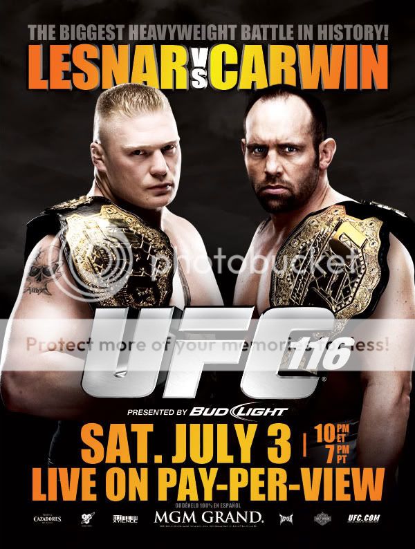 Geriausiai, zinoma, pasimatys pries pat kova, kai ref duos instrukcijas, taciau as labai nenoriu tiket, kad Lesnar i kova eis mazesnio svorio nei Carwin - Brock tai butu pirmas kartas, ir tai potencialiai gali sukelt problemu wrestlinant..