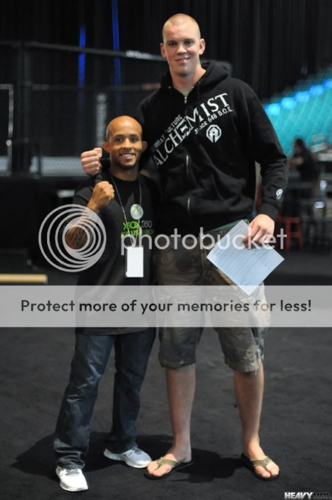 Visu pirma, pries pasineriant i pagrindinia sudeti, tiesiog reikia pagirti Demetrious "Mighty Mouse" Johnson, kuris savo UFC debiute nugalejo viena is visu laiku geriausiu lengvesnio svorio kovotoju, Norifumi "KID" Yamamoto (kaip skaudu man tai bebutu), o antram Octagon pasirodime paeme pergale pries buvusi WEC Bantamweight Championa ir, vienu metu, Top 5 pound-for-pound laikoma kovotoja, Miguel Torres. Zmogus stato sau labai ispudinga reziume ir manau yra arba sekantis pretendentas i Cruz/Faber (UFC 132) rematcho nugaletojo titula arba maksimum vienoje kovoje nuo №1 pretendento pozicijos. Ir cia kalbame apie maziausio ugio UFC kovotoja, kuris kartu su kovotojais kaip Benavidez galetu persikelti i 125 svaru flyweight diviziona, kuri kompanija zada netrukus isteigti. Beje, cia smagi nuotrauka su, vienoje sudetyje kovojusiais, zemiausiu (Johnson 5'3") ir auksciausiu (Struve 6'11") kompanijos kovotojais: